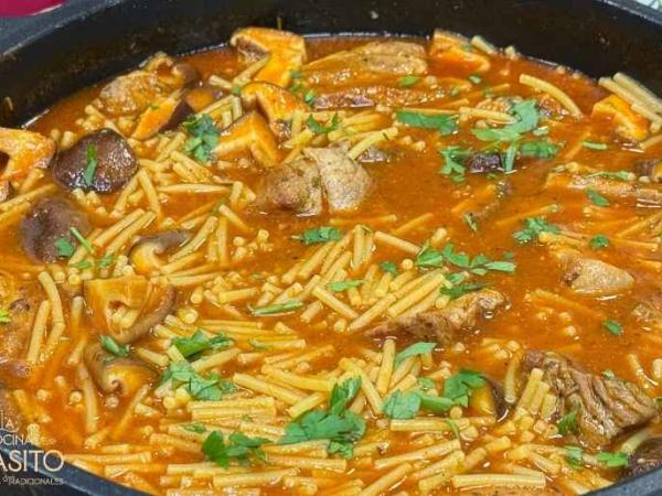Cazuela de fideos con costillas y setas al estilo casero
