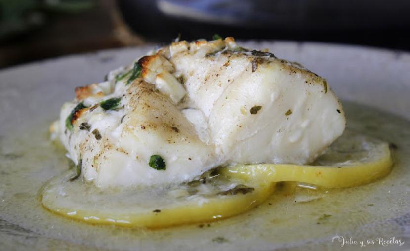 Lubina a la espalda jugosa con patatas y ajada: receta fácil