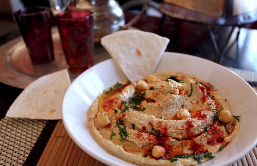 Hummus con calabacín plancha y garbanzos fritos especiados