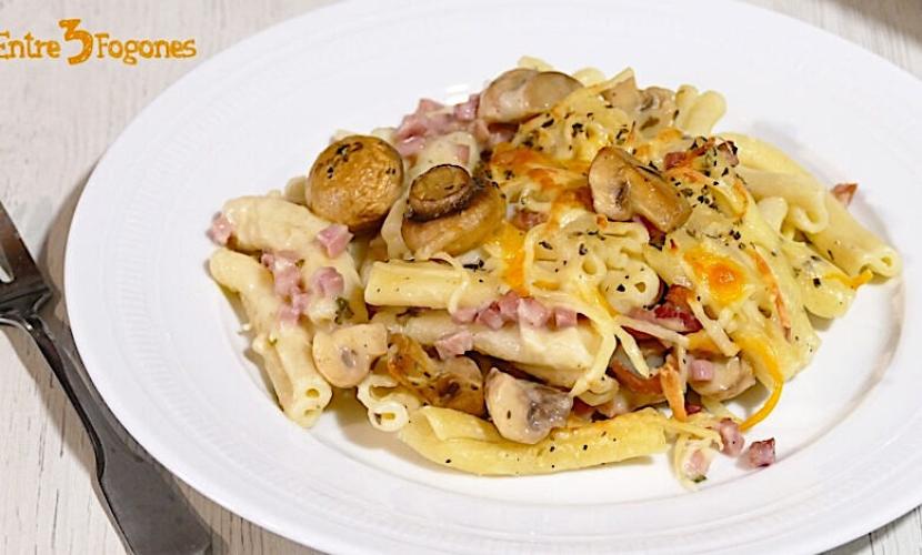 Pasta con champiñones al ajillo y bechamel gratinada con queso