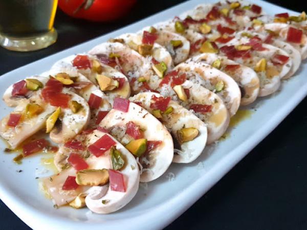 Carpaccio de tomate con atún, aguacate y vinagreta de albahaca