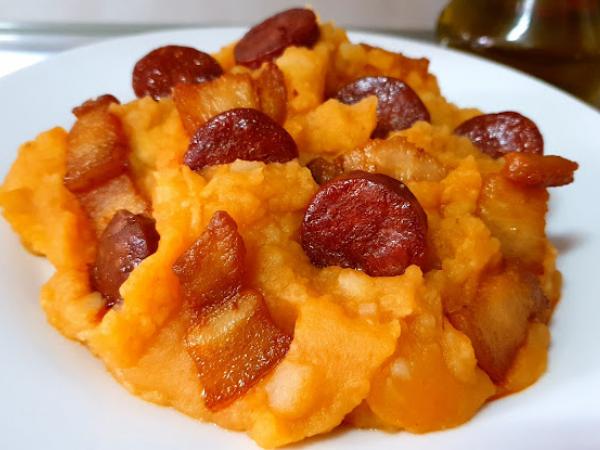 Solomillo de cerdo envuelto en bacon al horno, con patatas