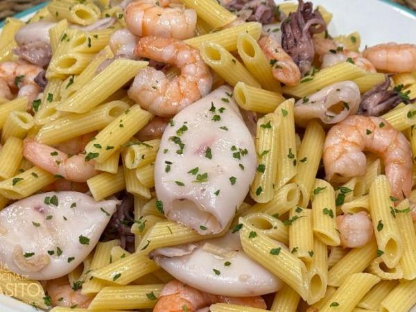 Macarrones con chipirones y langostinos al ajillo