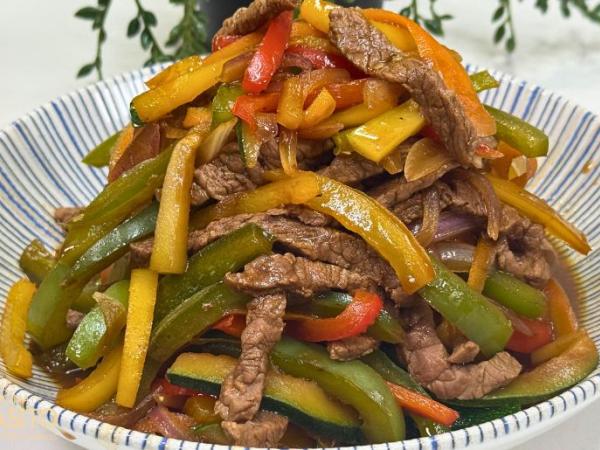 Salteado de ternera con pimientos zanahoria y cebolla