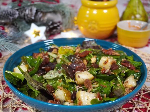 Ensalada de pera, tomates secos y vinagreta de miel y mostaza