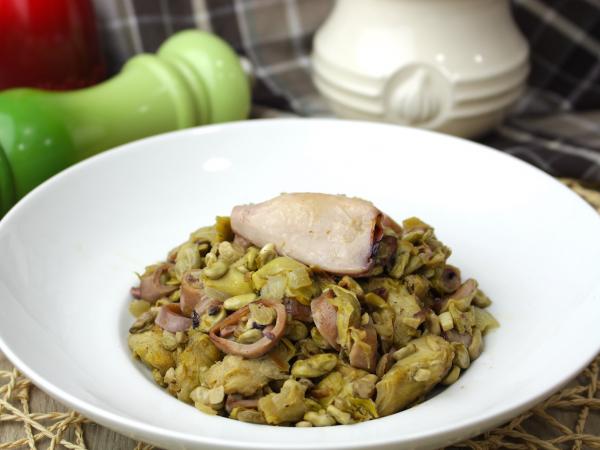 Habitas fritas con chipirones y alcachofas