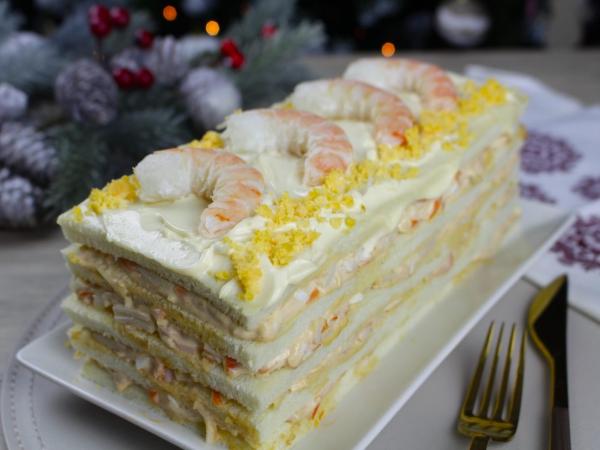 Pastel de marisco con pan de molde, cangrejo y langostinos