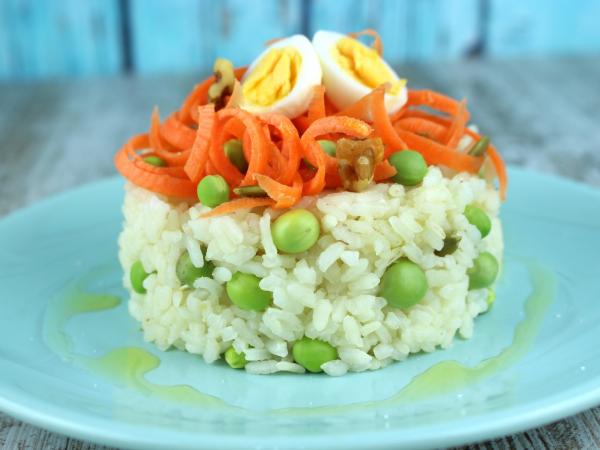 Ensalada de arroz con zanahorias, guisantes frescos y huevos de codorniz