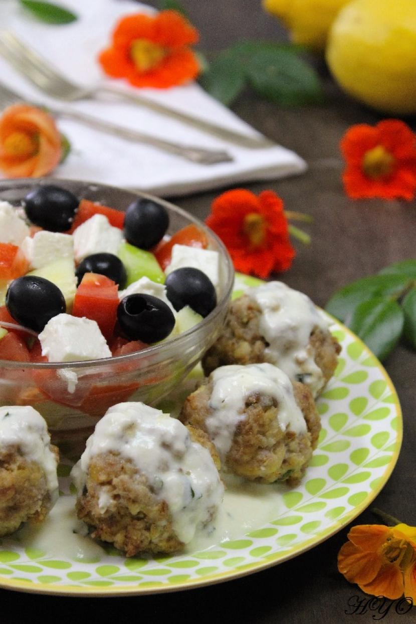 Albóndigas de carne con salsa de yogur y ensalada estilo griegoReceta de Hogar y OcioPublicada en Carnes, pollo y otras aves Ver la receta paso a paso Quizás te interesen también estas recetasAbóndigas con tomateJulia y sus RecetasTernera al chocolateJulia y sus RecetasTiras de pollo fritoAnna Recetas FácilesConejo al ajillo receta fácil y tradicionalcocineraymadreCallos de ternera en salsa:La cocina de Merche BorjasLomo de cerdo en salsa de vinoLa Cocina de Masito