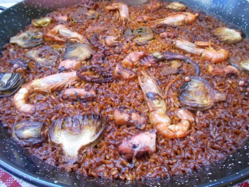 Arroz con pulpo, gambones y alcachofas