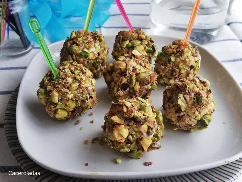 Bolitas de queso, mermelada y pistachos. un aperitivo original, fácil y riquísimo