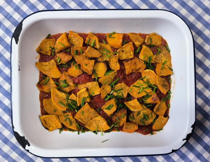 Boniato al horno con de salsa de tomate, lima y cardamomo