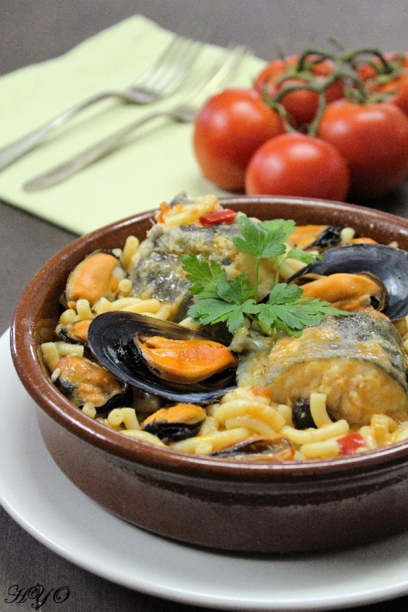 Cazuela de fideos con congrio y mejillones