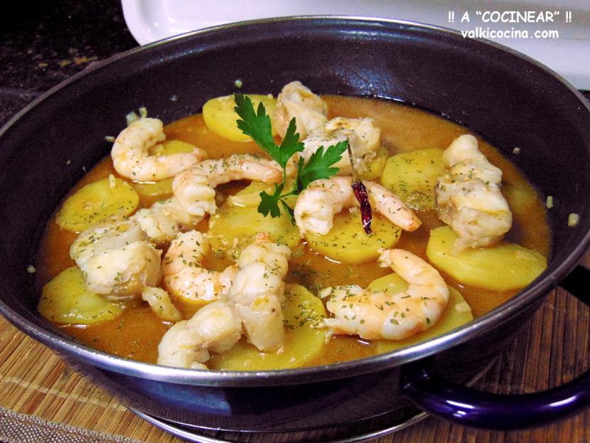 Cazuela de patatas, rape y langostinos fácil