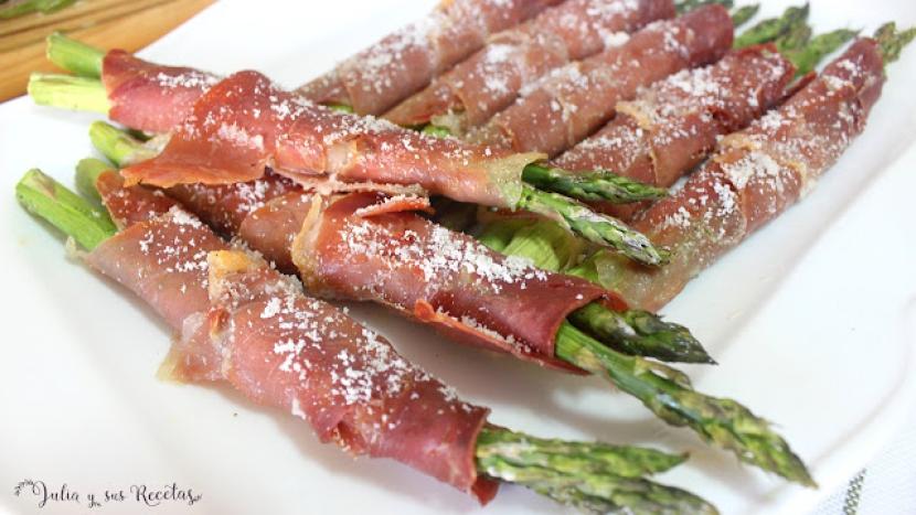 Espárragos verdes al horno con jamón y parmesano