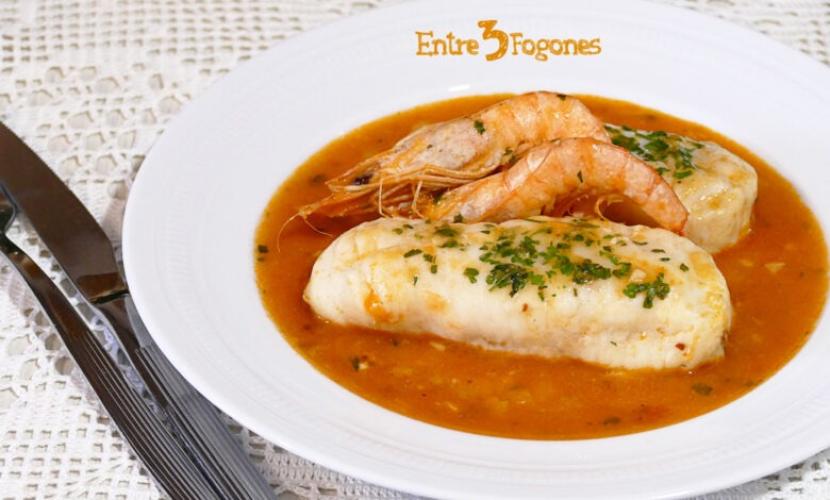 Lomos de merluza en salsa con gambas