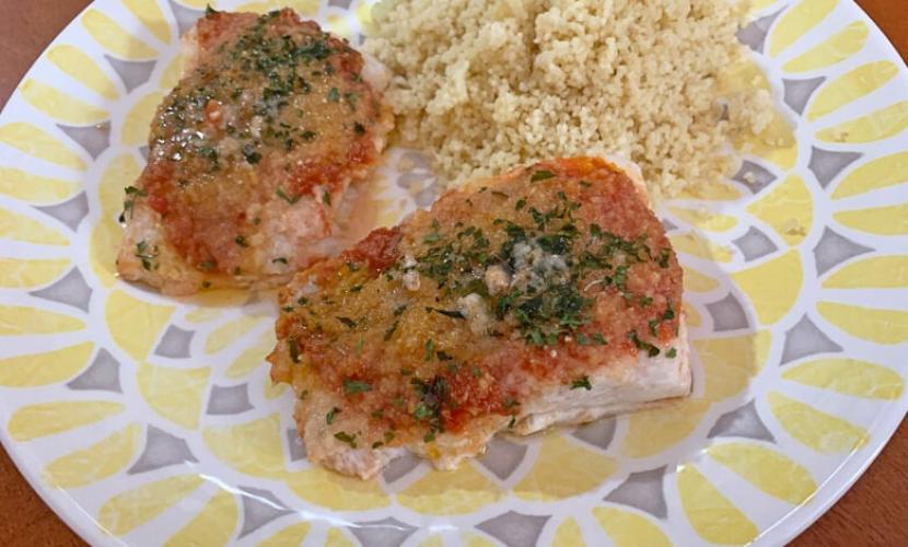 Lubina a la espalda jugosa con patatas y ajada: receta fácil