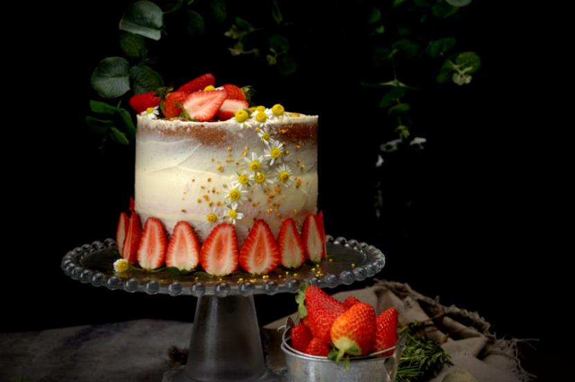 Naked cake de camomila con cheesecake de fresas y mermelada casera