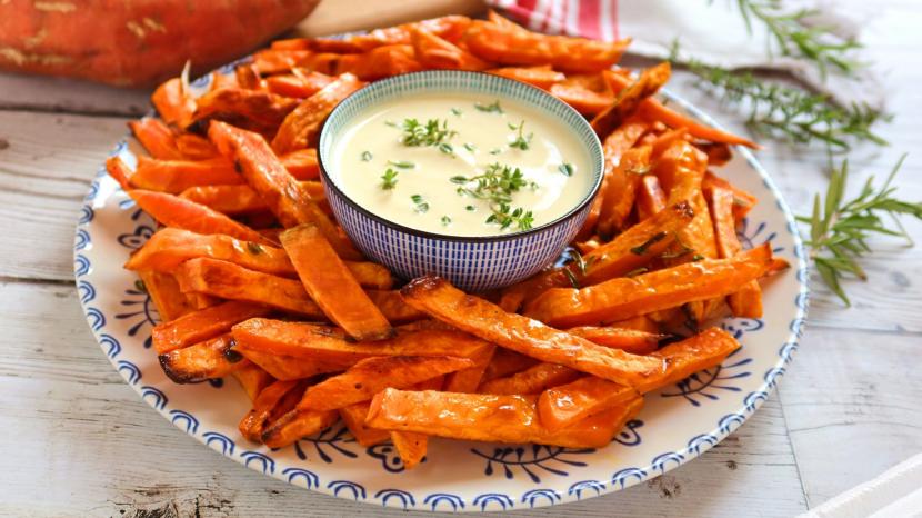 Palitos de boniato al horno con salsa de yogur, receta de picoteo