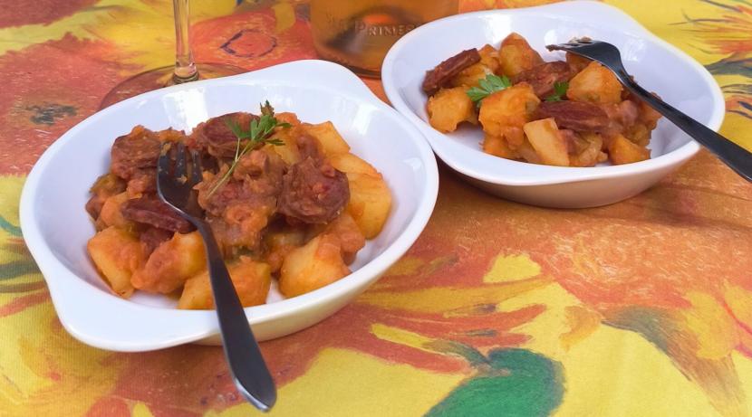 Patatas guisadas con chorizo, un clásico en forma de tapa, acompañadas con vino aires rosé de protos