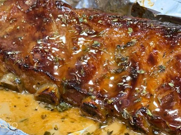 Costillas de cerdo asadas con miel y salsa de cebolla caramelizada