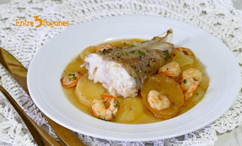 Rape al horno con patatas y gambas