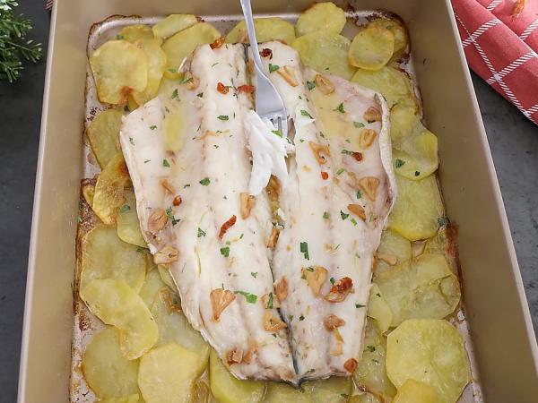 Lubina a la espalda jugosa con patatas y ajada: receta fácil