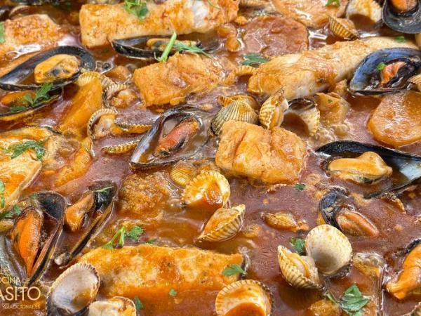 Zarzuela de pescado y marisco con pescado congelado y patatas