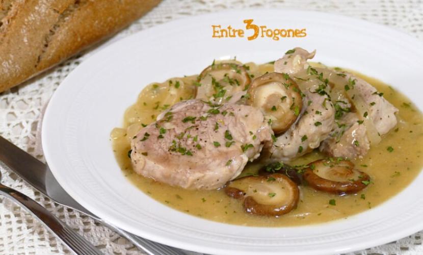 Solomillo de cerdo en salsa de cebolla con setas shiitake