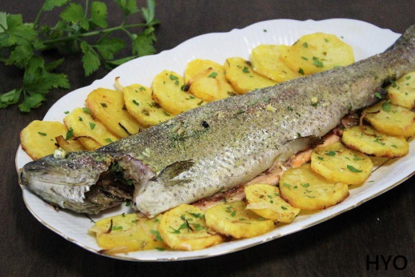 Lubina a la espalda jugosa con patatas y ajada: receta fácil
