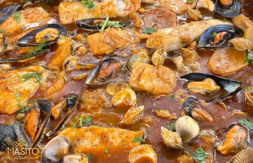 Zarzuela de pescado y marisco con pescado congelado y patatas