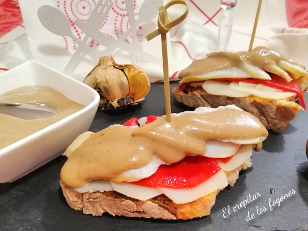 Bocaditos de patata y jamón con salsa de piquillos y miel