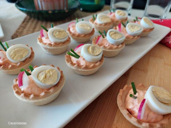Tartaletas con crema de pimiento asado y huevos de codorniz