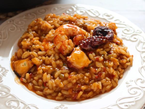 Arroz meloso de pulpo y gambones al ajillo