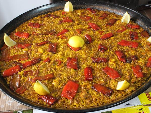 Paella de pollo y pimientos rojos
