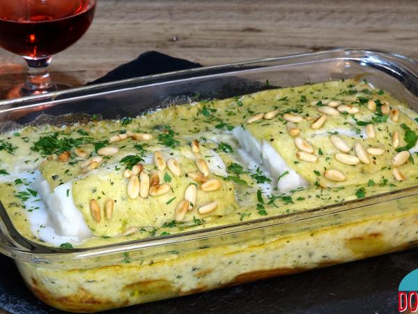 Bacalao al horno con patatas y bechamel de calabacín