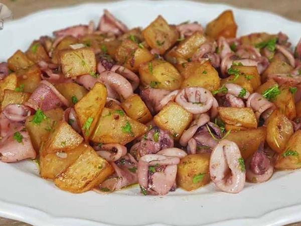 Guiso de calamares con langostinos y almejas