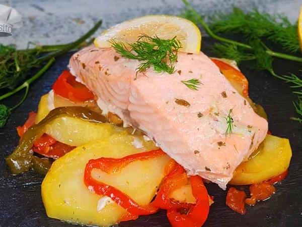 Salmón al horno con patatas panaderas