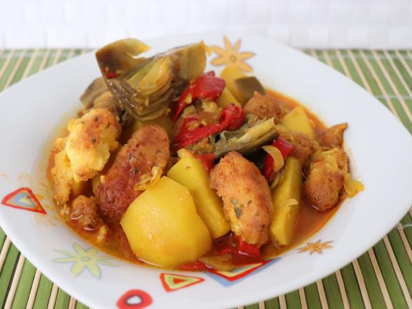 Guiso de patatas y buñuelos de bacalao
