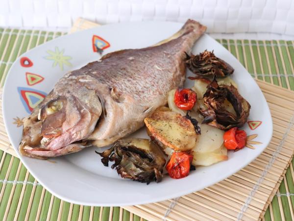 Pargo rosado al horno con alcachofas y tomatitos