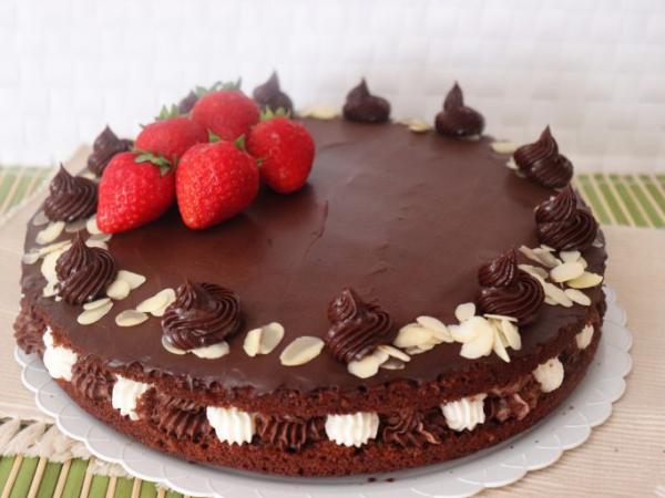 Tarta de nata y trufa con bizcocho de chocolate y almendra
