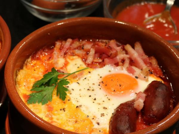 Huevos al plato con chorizo, baicon y queso