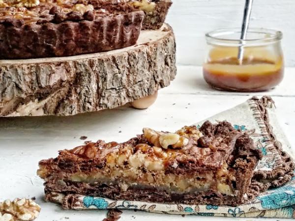 Tarta de nueces y chocolate con salsa toffee